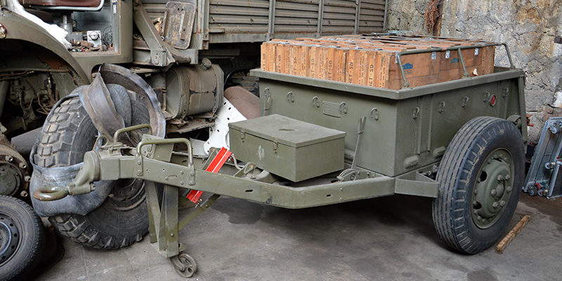 M10 Ammo Trailer has been designed to be mainly pulled by Priest M7 tank, 105mm Sherman, but could also be pulled by class 2,5 Tons trucks, half-tracks, armoured vehicles etc. Maximum of three M10 trailers could be coupled in a line to the above vehicles. The trailer carried the following ammunitions : 155mm, 105m and 75mm and was manufactured by three companies from 1942 to 1945 : Fruehauf Trailer Company, Yougstown Steel Door Company and Schlem Brothers. Univem’s M10 Ammo trailer is a 1944 Fruehauf Trailer.